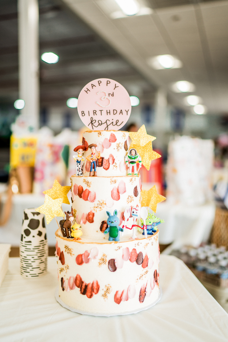 We made our own cake topper using this piece of acrylic and my friend Ariel painted and handlettered “Happy 3rd Birthday Rosie” on. We also added these mini Toy Story figurines and stars to the cake!