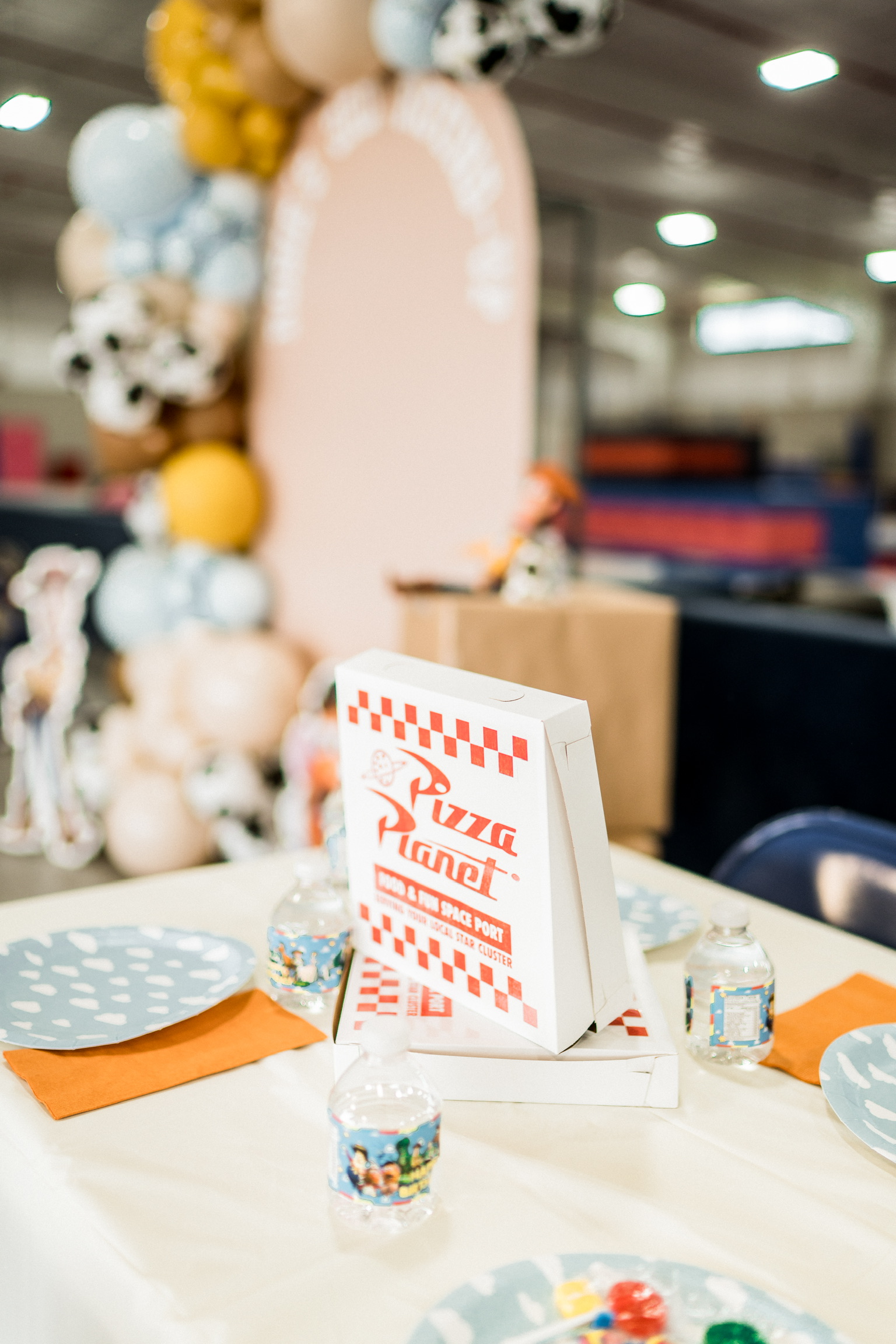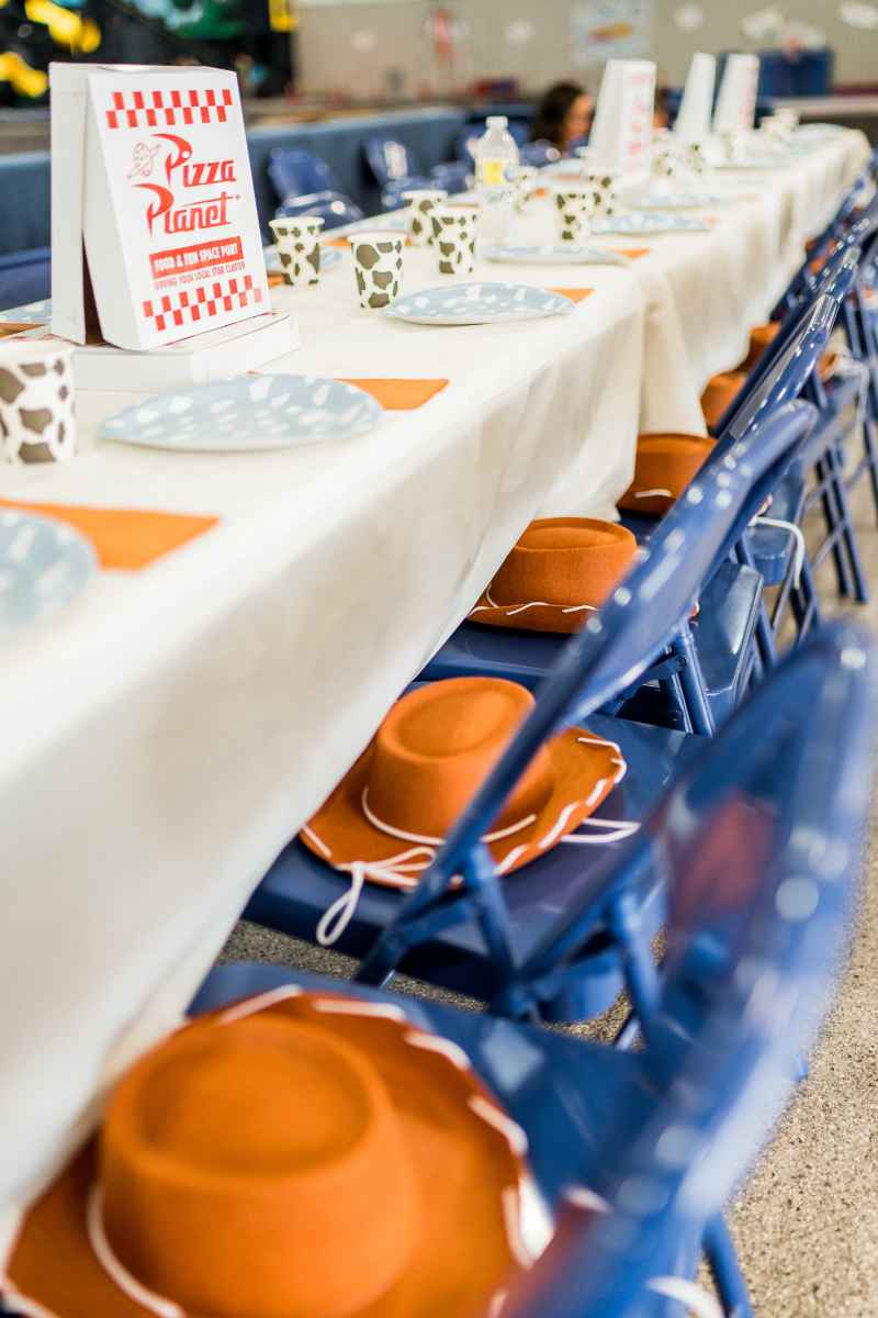 We designed the Pizza Planet graphic in Canva then printed onto the sticker sheet and stuck the stickers on each pizza box! We didn’t actually eat pizza out of these, just used them on the tables for decor.